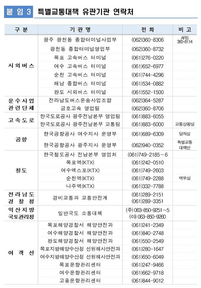 귀성·귀경 교통 편의를 위해 특별교통대책 상황실을 운영한다. 시내·농어촌버스는 증회나 운행시간 연장을 하고, 공원묘지 등 일시적 수요 증가 노선은 확대한다. 해상 분야는 연안여객선 51개 항로 78척과 여객선터미널 5개소 안전관리를 강화한다.