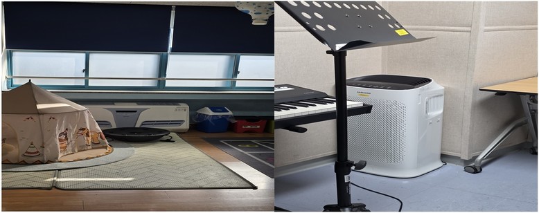 | ▲ (좌) 조치원대동초 바닥형 공기정화장치 설치 모습, (우) 세종예술고 연습실 공기청정기 설치 모습 |