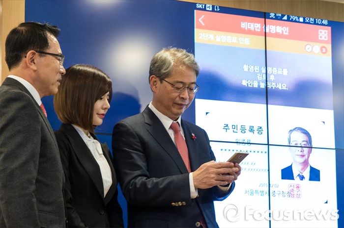 (서울=포커스뉴스) 2일 오전 서울 중구 신한은행 본점에서 열린 '비대면 실명확인 서비스 시연회'에 참석한 임종룡 금융위원장(오른쪽)이 스마트폰을 이용한 계좌 개설을 시연하고 있다. 은행 창구를 방문하지 않고 계좌를 개설할 수 있는 제도인 '비대면 실명확인' 도입 추진으로 홍채·정맥·지문·얼굴·목소리와 같은 정보를 활용한 생체인증 기술의 주요 금융기관 도입이 가속화되고 있다.