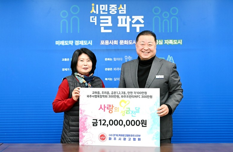 [파주시 세계타임즈=송민수 기자] 파주시는 22일 파주시광고협회로부터 지역 내 어려운 이웃을 위한 ‘사랑의 이웃 돕기’ 성금 1,200만 원을 기탁받았다고 밝혔다.