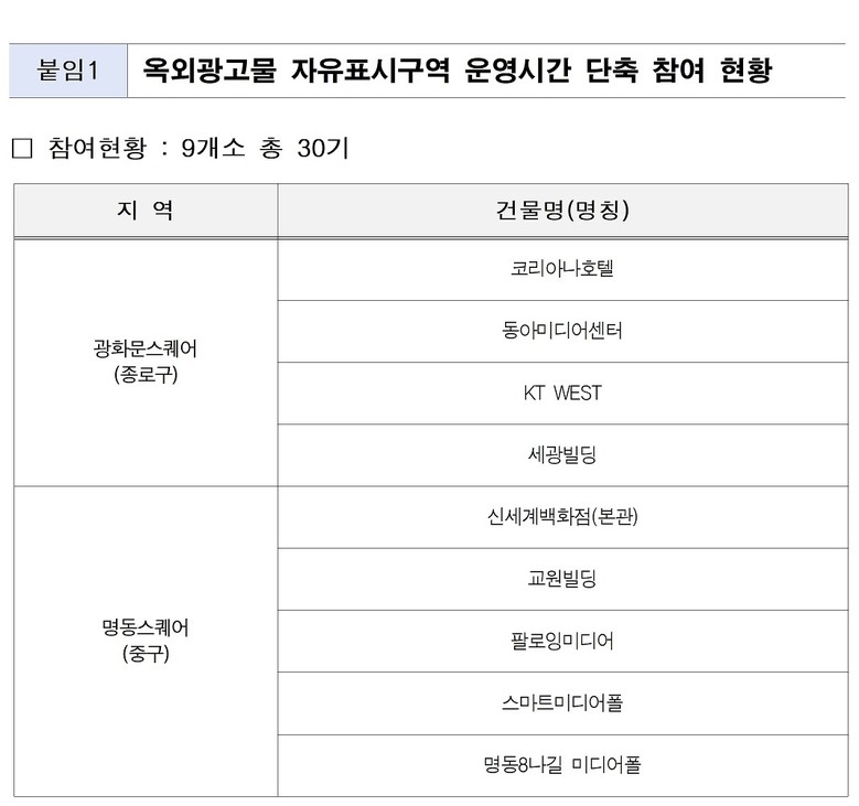 따라서 기존에 오전 6시~자정까지 운영되어 온 광화문.명동 옥외광고물 자유표시구역 내 대형 전광판 총 30기는 6일(월) 오전 7시~오후 11시까지 시작 및 종료시각을 1시간씩 단축한다.