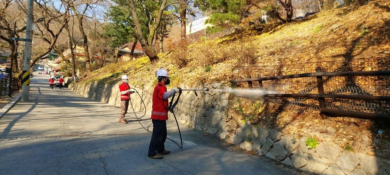 | ▲ 강북구 산림재난대응단이 산불지연제를 살포하고 있다. |