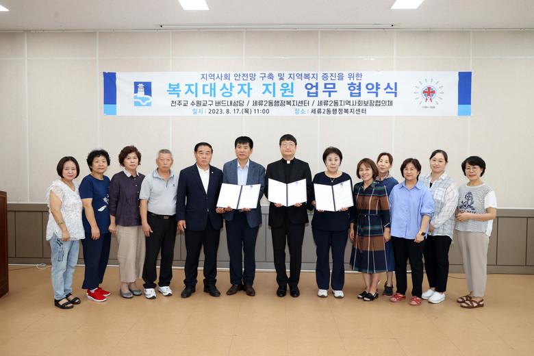 세류2동, 세류2동 지역사회보장협의체, 버드내 성당이 함께 참여한 이번 협약식은 지역복지 증진을 위해 인적.물적 자원을 교류하고자 마련한 지역사회 복지대상자 지원사업의 일환이다.