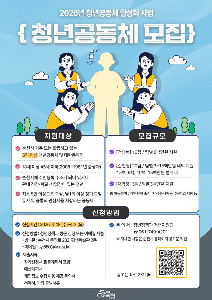 지원 대상은 순천시에 거주하거나 관내 직장·학교·사업장에서 활동하는 18세~45세 청년들로 구성된 5인 이상 공동체이며, 올해는 대학생 동아리까지 대상을 확대해 청년층의 참여 폭을 한층 넓힐 계획이다. 다만, 동일·유사 사업으로 중앙부처 또는 지자체 등의 지원을 받는 경우나, 단순 친목 또는 영리 목적의 모임 등은 지원 대상에서 제외된다.