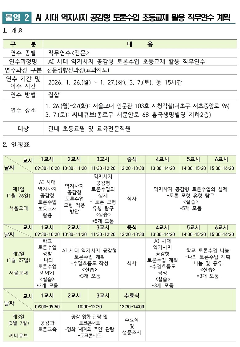 아울러 서울시교육청은 교재를 발간에 맞추어 이를 활용한 직무연수도 운영한다. 해당 연수는 1월 26일부터 서울교육대학에서 이론과 실습을 병행하는 방식으로 진행되며, 교사들이 실제 수업에서 역지사지 공감형 토론수업을 효과적으로 운영할 수 있는 역량을 기를 수 있도록 지원할 계획이다.