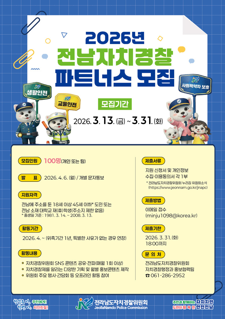 - 4월 발대식·1년 활동…우수 활동자 표창 등 다양한 혜택 - [전남 세계타임즈=우덕현 기자] 전라남도자치경찰위원회는 도민과의 소통을 강화하고 현장 중심 자치경찰 치안 활동을 함께할 ‘2026년 전남자치경찰 파트너스’를 31일까지 모집한다고 밝혔다.