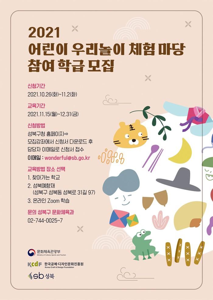 ● 교육대상 : 성북구 및 수도권 초등학생(학급별 신청/ 돌봄교실 신청 가능) ● 모집일정 : 2021. 10.26(화) ∼ 11. 2(화) ● 교육일정 : 2021. 11.15(월) ∼ 12.31(금) ● 교육내용 : 1교시 전통놀이 체험 마당(고누, 공기, 산가지, 화가투 중 택1) ※시간 상 전통놀이 교육 이후 누에고치 실뽑기 체험/ 비단 종류 알아보기 교육제공 가능 ● 교육방법 : 찾아가는 학교, 성북예향재 방문, 비대면 온라인 교육 중 택1 ● 참 가 비 : 무료 ● 교육문의 : 02-744-0025∼27 |