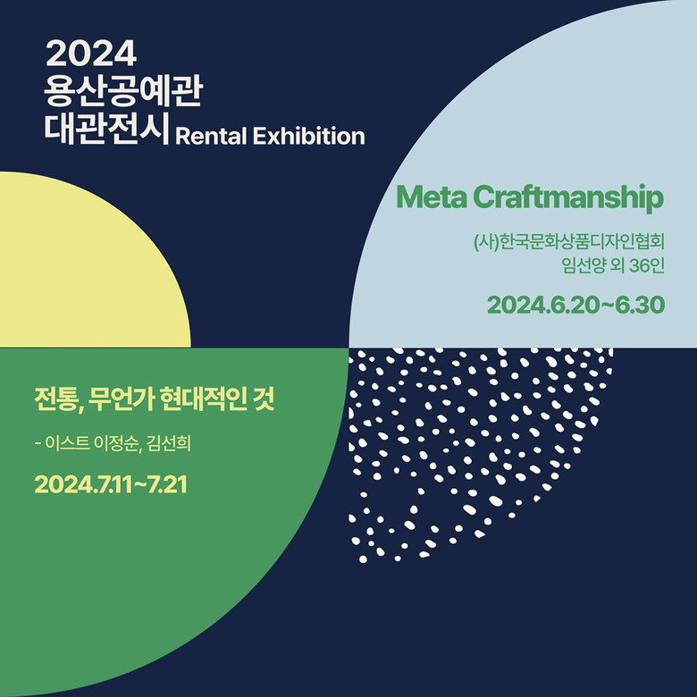 이후 8월 대관전시로 ‘아름다운 빛깔구이 칠보예술연구회전’과 ‘제1회 한일 우호 전시회 우정의 공예전’을 연다. 용산공예관은 한강진역 3번 출구 인근에 있다.