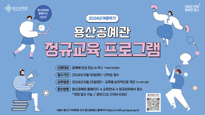 강좌 확인 및 신청접수는 용산공예관 누리집(crafts.yongsan.go.kr)에서 할 수 있다. 유선 및 방문접수도 가능하며 용산공예관은 화요일부터 일요일까지 오전 10시부터 오후 7시까지 열려있다.