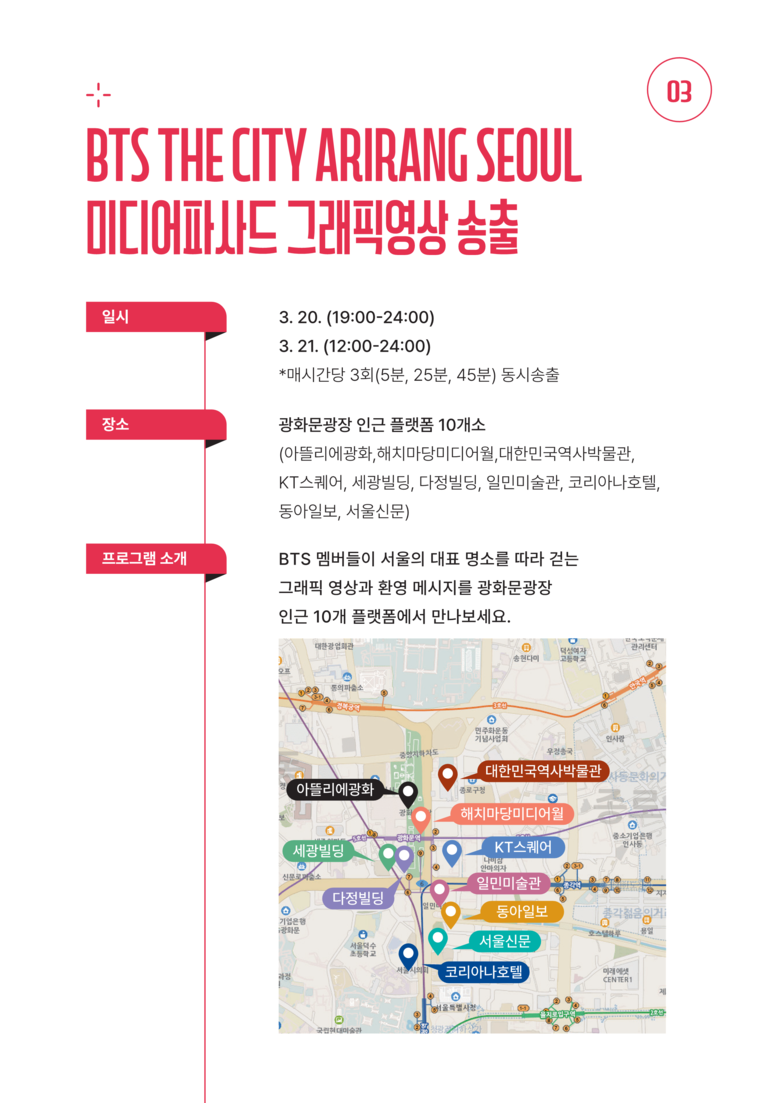 앞서 공연주최(하이브) 측은 방탄소년단의 신보 발매에 맞춰 3월 20일부터 4월 19일까지 동대문디자인플라자(DDP)와 한강공원 등 주요 거점에서 글로벌 아미들을 위한 체험 콘텐츠를 선보인다고 밝혔다. 서울시 또한 여기에 더하여 관광객들이 공연 전후 경험할 수 있는 즐길거리를 풍성하게 발굴·홍보한다는 계획이다.