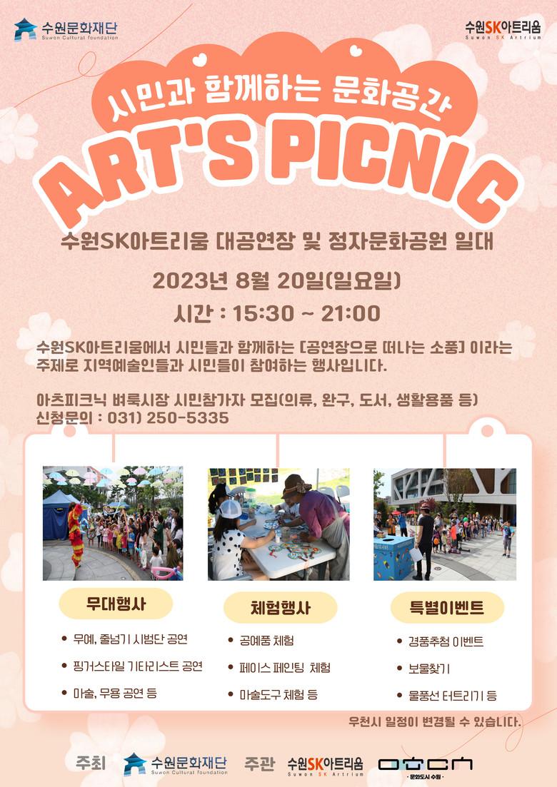 시민과 함께하는 문화공간 <아츠 피크닉>은 오는 20(일) 15:30 ~ 21:00 수원SK아트리움 대공연장 로비 및 정자문화공원 일원에서 진행되며 참가비는 무료이다.