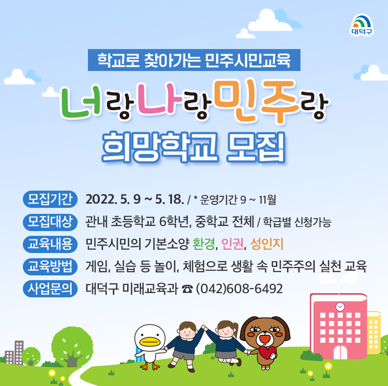[대덕구=세계타임즈=이채봉 기자] 대전 대덕구는 미래세대를 주체적인 민주시민으로 양성하고 참여와 소통의 교육문화를 조성하기 위해 학생과 함께하는 ‘너랑나랑민주랑’ 민주시민교육 프로그램을 운영한다고 5일 밝혔다.
