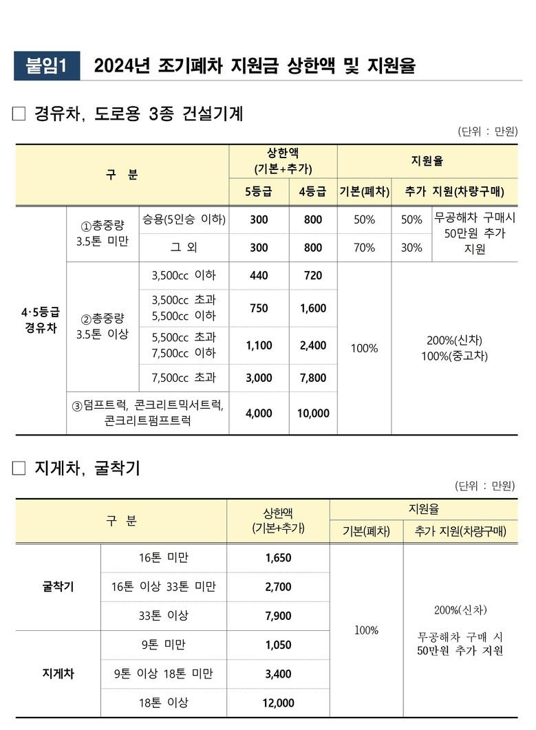 ‘4등급’ 차량 중 3.5톤 미만은 최대 800만 원, 3.5톤 이상 중 7,500cc 초과 시 최대 7,800만 원까지 지급한다. ‘5등급’ 및 ‘건설기계’도 상한액 내에서 보조금이 지원되며, 저소득층과 소상공인에게는 상한액 내에서 100만 원을 추가 지급한다.