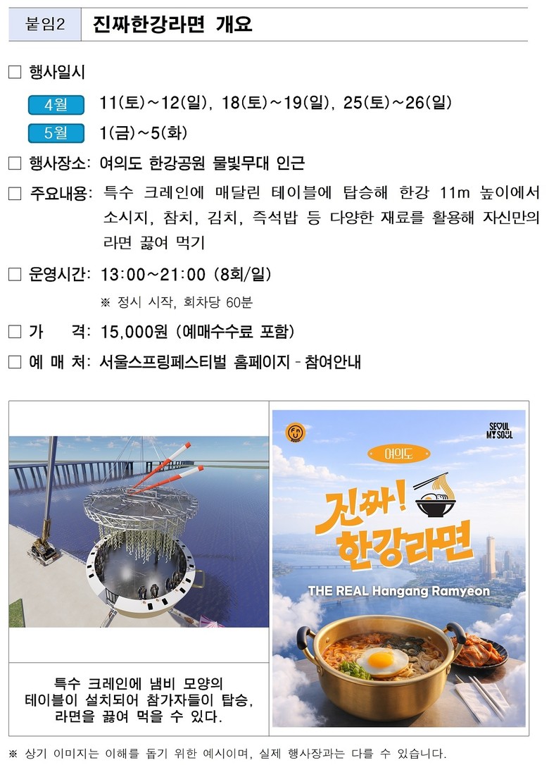 - 한강 상공 위에서 맛보는 ‘진짜한강라면’ 등 체험 프로그램은 3.27.(금)부터 예매 시작