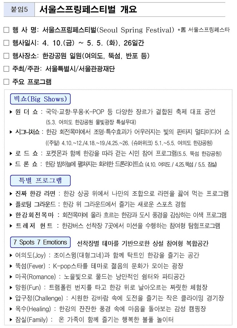 올해 서울스프링페스티벌은 한강을 배경으로 K-컬처와 이색체험, 시민참여 콘텐츠를 결합한 서울시 대표 봄 축제로 4월 10일부터 5월 5일까지, 총 26일간 다채로운 프로그램을 선보일 예정이다.