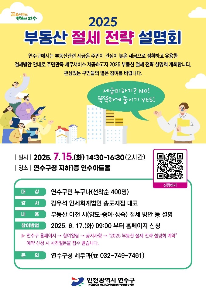 복잡하고 어려운 부동산 세금 관련 다양한 고민 해결 기대 [연수구 세계타임즈=심하린 기자] 연수구(구청장 이재호)는 내달 15일(화) 오후 2시 30분부터 구청 연수아트홀에서 잦은 세법 개정으로 복잡한 부동산 관련 세금에 어려움을 느끼는 구민들을 위한 ‘2025 부동산 절세 전략 설명회’를 개최한다.