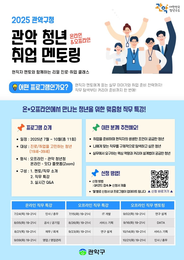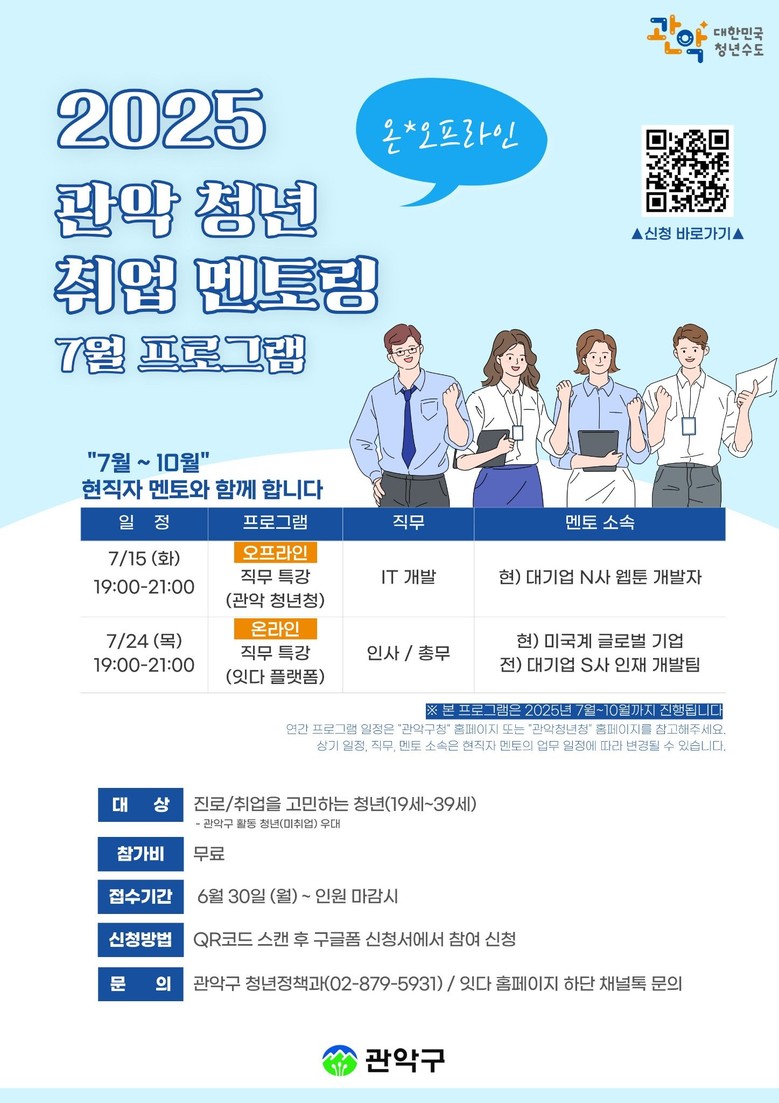 - 진로/취업을 고민하는 청년이라면 누구나 신청 가능 [관악구 세계타임즈=이장성 기자] 관악구(구청장 박준희)가 올해부터 기존 ‘삼성전자 청년 취업멘토링 사업’을 확대 개편하여, 「2025. 관악 청년 취업멘토링」 사업으로 새롭게 추진된다.