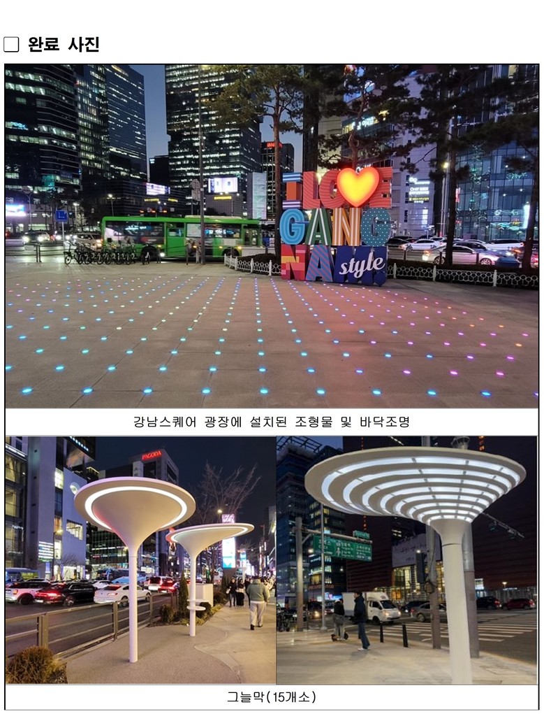 특히, 거리 곳곳에 새롭게 설치된 17개의 그늘막은 보행자들에게 더 편리한 환경을 제공한다. 독특한 하얀 버섯 모양의 디자인을 적용한 그늘막은 강남대로를 상징하는 새로운 랜드마크이자 특별한 거리 풍경을 연출한다. 각 그늘막은 무선 핸드폰 충전기능을 갖추고 있으며, 대형 그늘막은 태양의 위치에 따라 이동하는, 최신 스마트 기술이 적용된 전동형 회전 캐노피로 설계됐다.