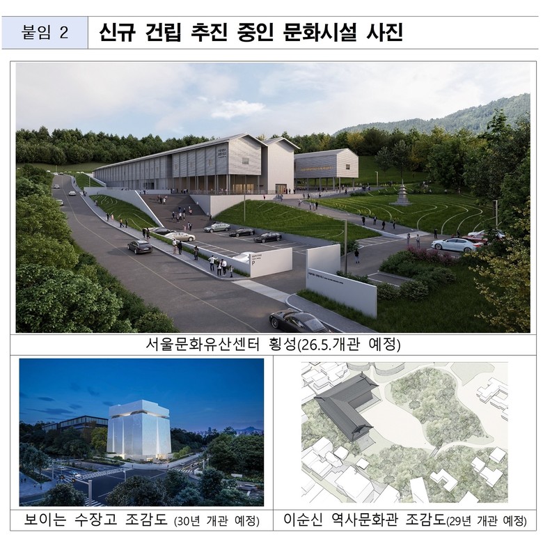 한편 시는 ‘서울문화유산센터(횡성)’, ‘보이는 수장고(서초구)’, ‘이순신 역사문화관(중구)’ 등 신규 문화시설 개관을 연이어 준비하고 있다.