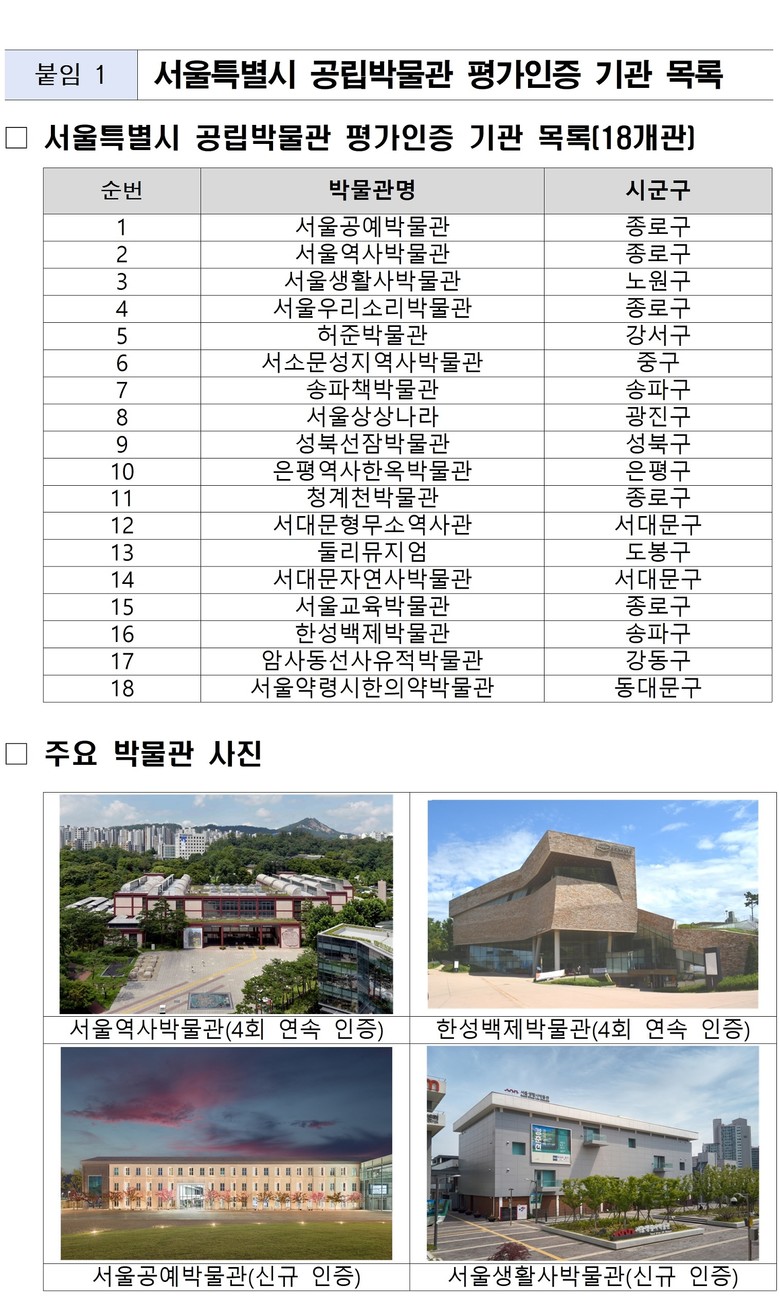 또한 개관 후 3년이 경과해 이번에 첫 평가인증 대상이 된 서울공예박물관(종로구), 서울생활사박물관(노원구), 서울우리소리박물관(종로구), 서소문성지역사박물관(중구), 송파책박물관(송파구) 등 5개소도 모두 우수기관 인증을 획득하는 성과를 거뒀다.