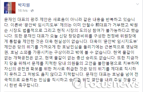 박 의원은 자신의 페이스북과 트위터에 "문‧안‧박 임시지도부 제안은 근본적으로 영남 패권, 호남 소외를 가중시키는 구상이라고 밖에 볼 수 없다"는 내용의 글을 올렸다.
