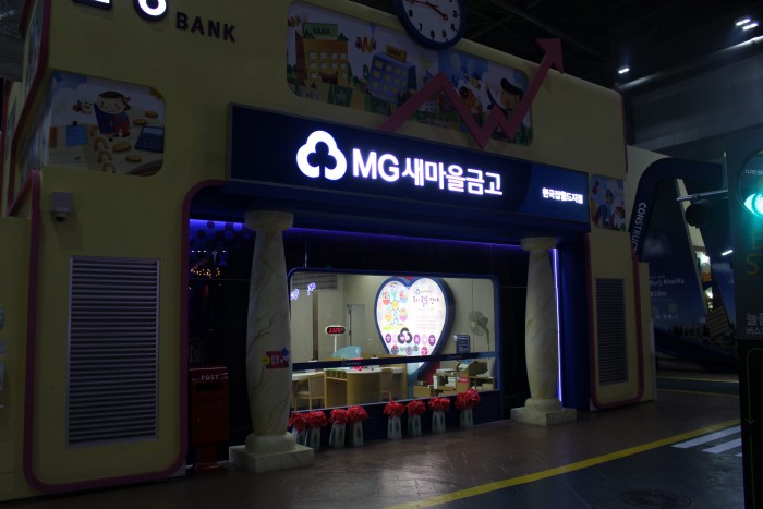 MG새마을금고 체험관은 '새마을금고 객장' 모습으로 꾸며져, 어린이들에게 금융업과 관련된 직업 체험을 할 수 있도록 구성됐다.