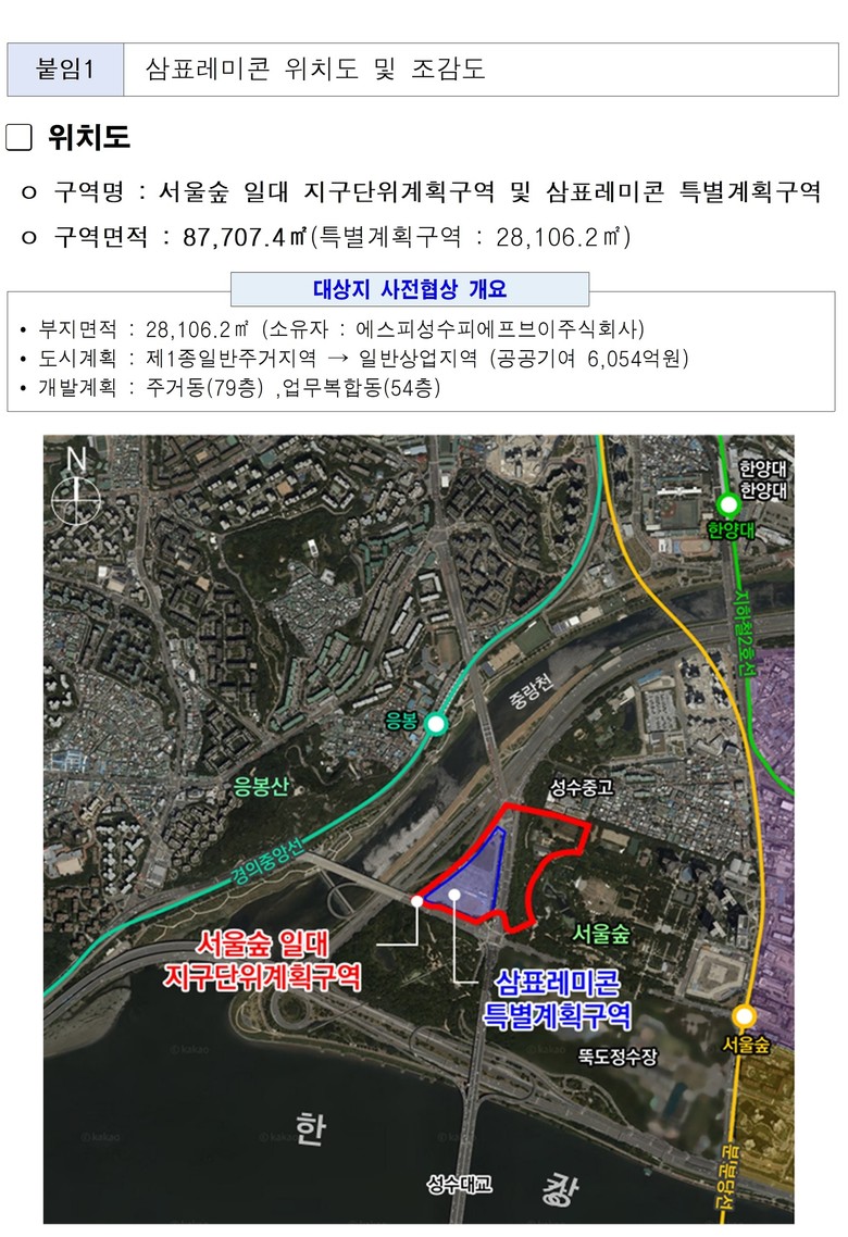 서울시는 성동구 성수동1가 683번지 ‘서울숲 일대 지구단위계획구역 및 삼표레미콘 특별계획구역 세부개발계획’을 2월 5일(목) 결정고시한다고 밝혔다. 이에 앞서 오세훈 서울시장은 3일(화) 오전, 현장을 찾아 진행 상황을 점검하고 미래 서울의 경쟁력을 견인할 랜드마크 사업의 속도감 있는 추진을 주문했다.