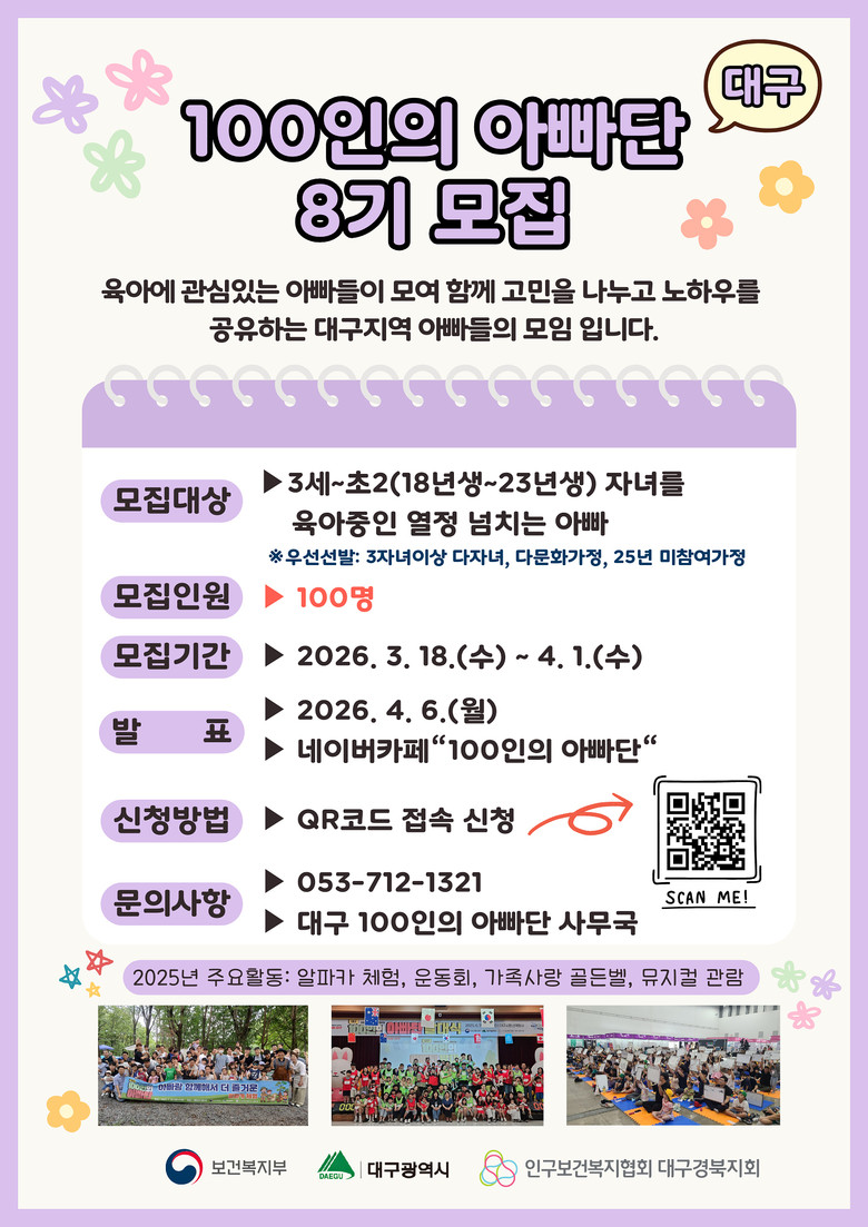 ▸ 다문화·다자녀 가정 등 우선 선발… 6월 발대식 개최 [세계타임즈=대구 한윤석 기자] 대구광역시는 아빠들의 적극적인 육아 참여를 독려하고 함께 육아하는 사회 분위기를 확산하기 위해 3월 18일부터 ‘2026년 제8기 대구 100인의 아빠단’ 활동 단원을 모집한다.