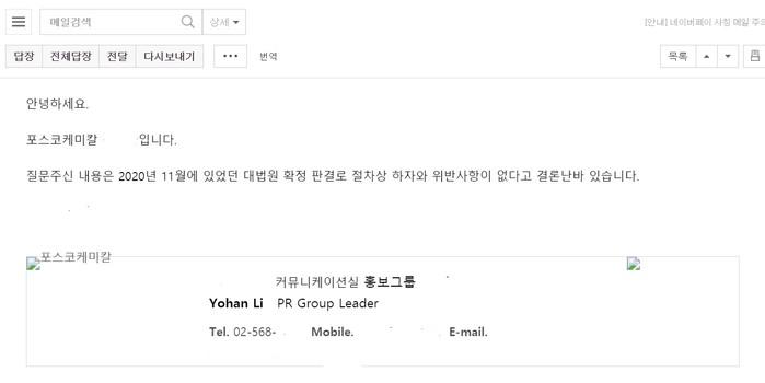 하지만 포스코케미칼 홍보팀에서는 "2020년 11월에 있었던 대법원 확정 판결로 절차상 하자와 위반사항이 없다고 결론났다"고 답변했다.