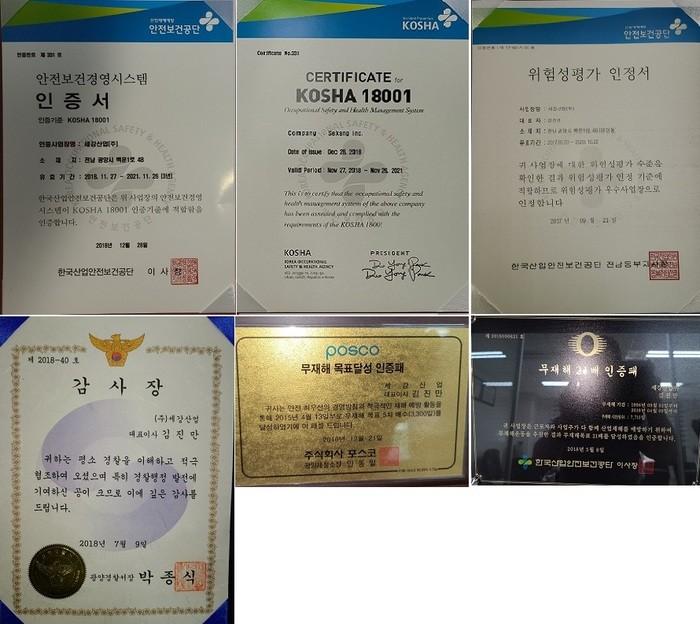 ▲ 세강산업이 받은 안전보건경영시스템 인증서, 위함성평가 인정서, 감사장, 무재해 목표달성 인증패, 무재해21배 인증패.