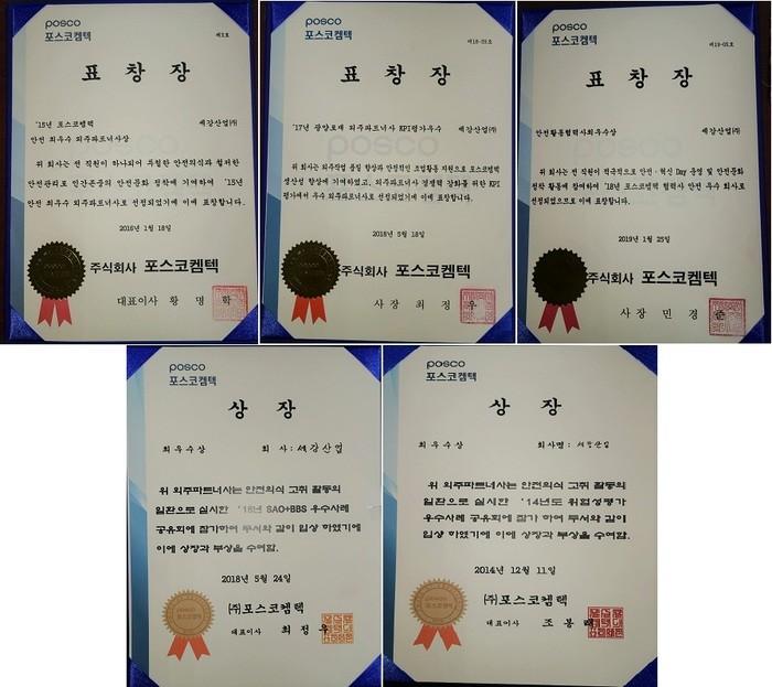 ▲ 새강산업이 지난 2016 1월 18일 포스코컴택 황명학 대표이사, 지난 2018 5월 18일 포스코컴택 최정우 대표이사, 지난 2019 1월 25일 포스코컴택 민경준 대표이사로 부터 받은 표창장과 지난 2018 5월 24일 포스코컴택 최정우 대표이사, 지난 2014 12월 11일 포스코컴택 조봉래 대표이사로 부터 받은 상장들.