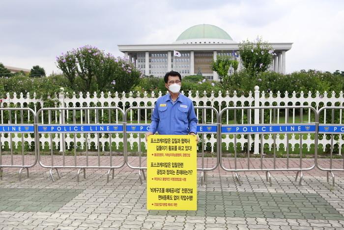 ▲ 세강산업 김진만 대표가 4일 오전 서울 영등포구 여의도 국회 정문 앞에서 포스코케미칼의 갑질을 규탄하는 1인 시위를 하고 있다