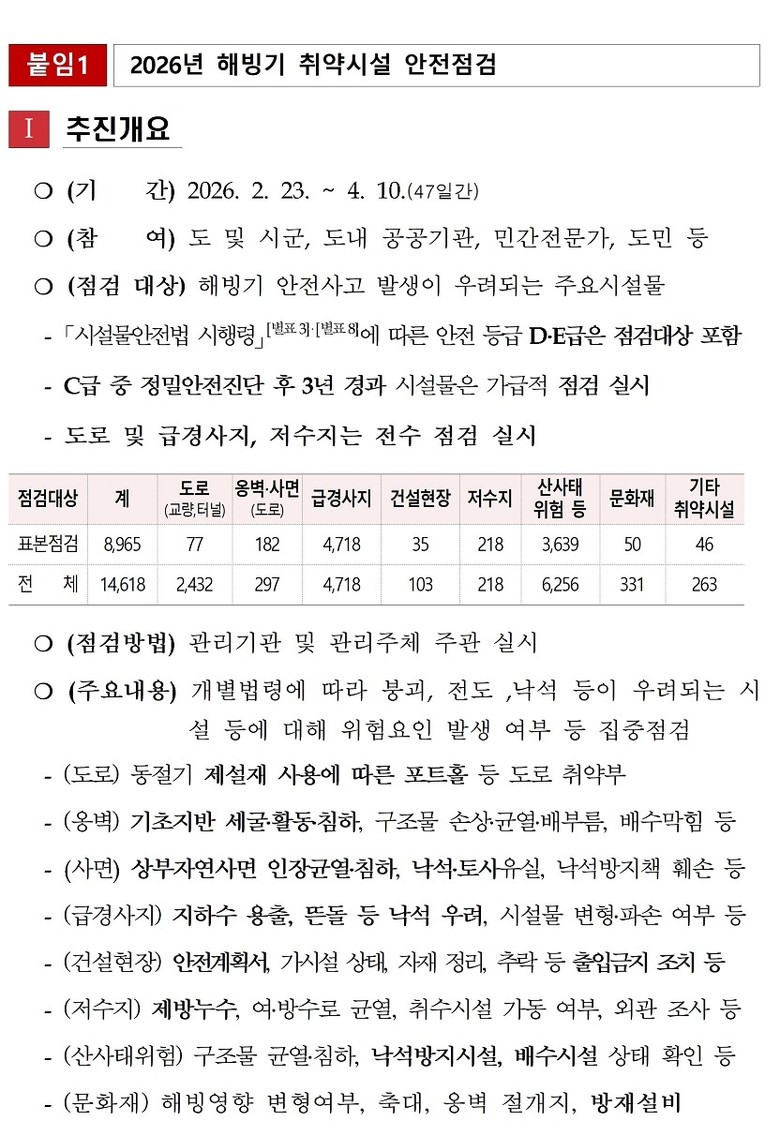 임현식 자연재난과장은 “봄철에는 얼었던 지반이 녹으면서 지반 변형과 낙석·붕괴 등 대형 인명피해로 이어질 우려가 있다”며 “도민들께서도 생활 주변 시설을 한 번 더 살펴보고 위험 요인이 발견될 경우 즉시 신고해 달라”고 당부했다.