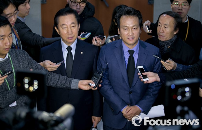 (서울=포커스뉴스) 26일 오전 서울 여의도 국회 정론관에서 예산결산특별위원회 김성태(왼쪽) 여당 간사, 안민석 야당 간사가 내년도 국회의원 세비 동결 등 예산안 관련 브리핑을 마친 뒤 취재진 질문에 답하고 있다. 여야는 지난 17일 운영위원회에서 내년도 국회의원 세비를 인상하는 예산안을 의결해 예결위로 넘겼지만, 비판 여론이 거세지자 세비 인상분을 반납하겠다고 전했다.
