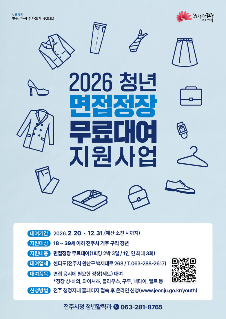 이 사업은 전주시에 거주하는 18세부터 39세까지의 구직 청년을 대상으로 면접에 필요한 정장 세트를 2박 3일간 무료로 대여해주는 사업으로, 1인당 최대 3회까지 이용할 수 있다.