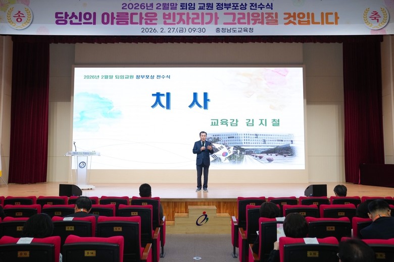 [충남 세계타임즈=이현진 기자] 충남교육청(교육감 김지철)은 27일(금) 도교육청 대강당에서 퇴임 교육공무원과 가족들이 참석한 가운데 2026년 2월 말 퇴직 교원에 대한 정부포상 전수식을 개최했다.