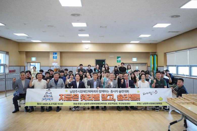 이번 대회에는 남양주시북부장애인복지관을 포함해 같은 법인 산하의 보호작업장, 주간보호센터 등 종사자 60여 명이 함께 했으며, 주광덕 남양주시장을 비롯한 김양원 장애인시설·기관연합회 회장, 김학영 장애인단체연합회 회장, 손기남 남양주시장애인체육회 수석부회장 등이 종사자를 격려했다.