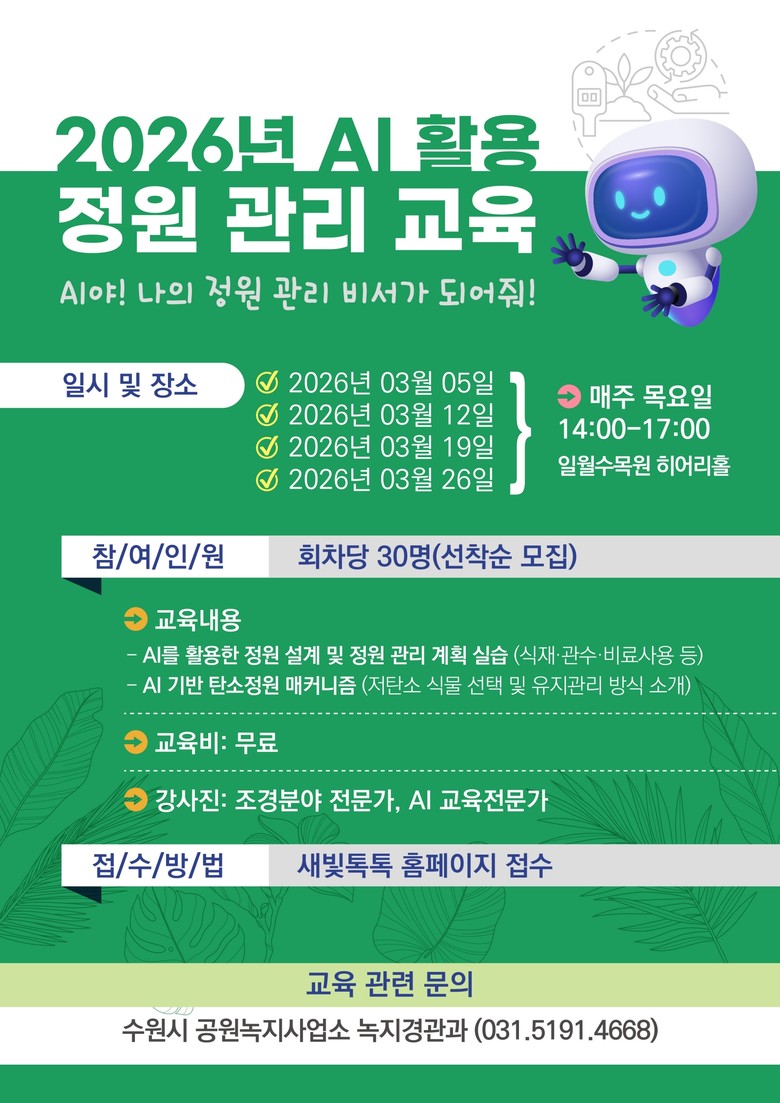 생성형 인공지능(AI) 교육 전문가와 조경·정원 분야 전문 강사진이 이론과 사례를 중심으로 강의한다. 수강을 원하는 시민은 수원시 시민참여 플랫폼 ‘새빛톡톡’에서 신청하면 된다. 선착순 모집이다.