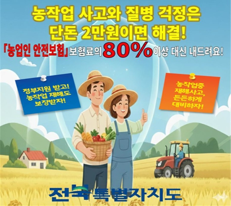 ○ 농작업 사고·질병까지 보장… 농가 부담은 연 2만 원 수준 [세계타임즈=전북 이상호 기자] 전북특별자치도는 농업인의 안전사고 예방과 생활 안정을 위해 보험료의 80% 이상을 지원하는 ‘농업인 안전보험’ 가입 확대에 나섰다.