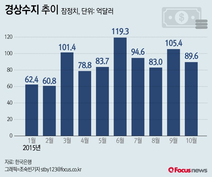 [세계타임즈 이현재 기자] 올 10월 중 경상수지가 89억6000만 달러 흑자를 기록해 44개월 연속 흑자행진을 이어갔다.