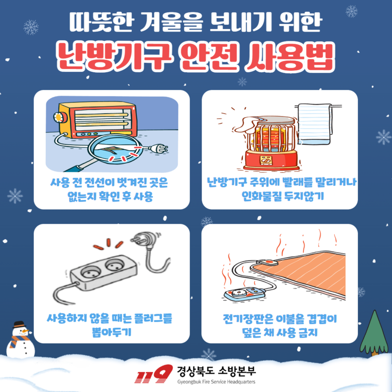 이에 따라, 경상북도 소방본부는 겨울철 화재 발생 예방을 위하여 다음과 같은 유의 사항을 도민들에게 당부했다.