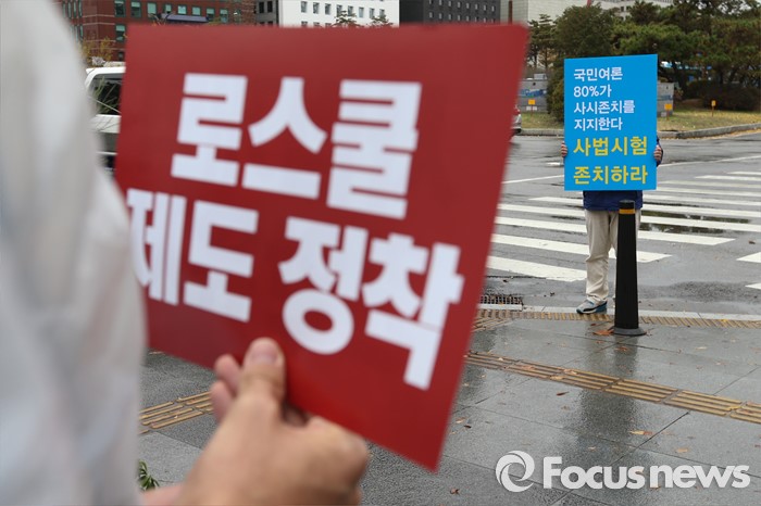 (서울=포커스뉴스) 18일 오전 서울 여의도 산업은행 앞에서 사법고시생이 사법시험 존치를 주장하는 일인시위를 하고 있다. 맞은편에서는 로스쿨 학생들이 변호사 시험법 개정안 반대를 촉구하는 결의대회를 열고 있다.