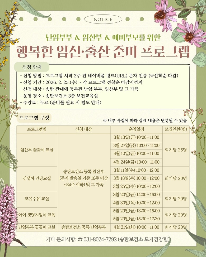 프로그램은 송탄보건소에 등록된 임산부 및 가족을 대상으로 하며, 네이버 폼을 통한 선착순 접수로 진행된다. 관련 문의는 송탄보건소 모자건강팀(031-8024-7292)으로 하면 된다.