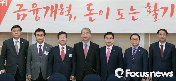 | △ 27일 오전 서울 여의도 국회 귀빈식당에서 열린 금융개혁 추진과제 등 논의를 위한 협의회에 참석한 김광림 위원장, 임종룡 금융위원장, 주형환 기획재정부 1차관 등 의원 및 관계자들이 취재진을 향해 포즈를 취하고 있다. <사진제공=포커스뉴스> |