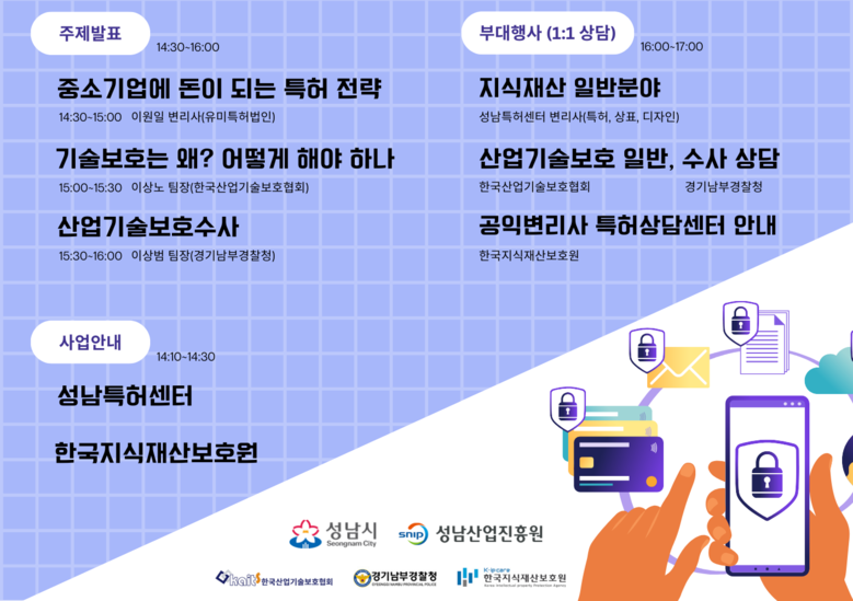 이번 세미나는 성남시, 한국산업기술보호협회, 경기남부경찰청과 공동으로 중소기업이 꼭 알아야 할 기술 보호 관련 핵심 내용들과 지식재산 전략 관련 내용을 소개하는 자리이다.
