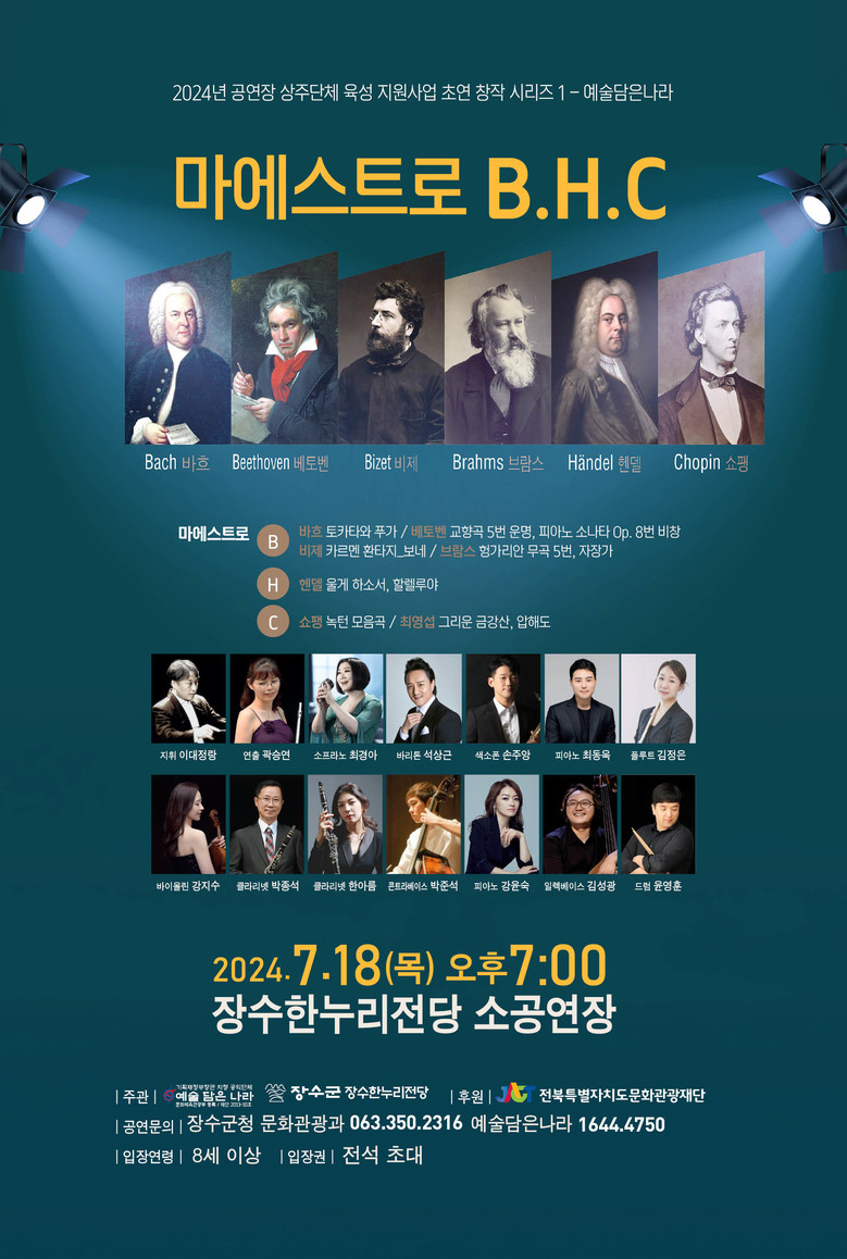 [장수 = 세계타임즈 김서주 기자] 장수군이 전북특별자치도 문화 관광재단 공모사업으로 추진하는 ‘마에 스트로 B·H·C’ 공연이 오는 7월 18일 오후 7시에 장수한 누리전당 소 공연장에서 열린다. 공연은 누구나 무료로 관람할 수 있으며, 공연 시작 10분 전까지 입장하면 된다.