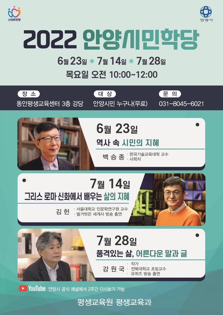 안양시는 2022 안양시민학당 제4강‘역사 속 시민의 지혜’를 오는 23일 한국기술교육대학 백승종 교수를 초빙해 연다고 밝혔다.