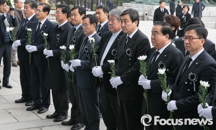 (서울=포커스뉴스) 이종걸 새정치민주연합 원내대표 등 의원들이 24일 오후 서울 여의도 국회 본청 앞에 마련된 故 김영삼 전 대통령 국가장 분향소에서 합동 조문을 하고 있다.