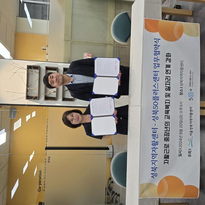 [성북구 세계타임즈=이장성 기자] 서울 성북구(구청장 이승로) 성북지역자활센터(센터장 조미연)와 성북50플러스센터(센터장 김일권)가 9월 20일(금) 중장년 자활참여자의 교육 및 일자리 연계 기회 확대를 위한 업무협약을 체결했다.