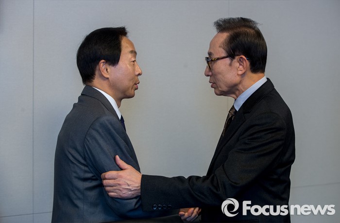 (서울=포커스뉴스) 이명박 전 대통령이 7일 오후 서울 강남구 대치동 사무실에서 故 김영삼 전 대통령 차남 김현철 전 여의도연구소 부소장과 만나 악수 하고 있다.